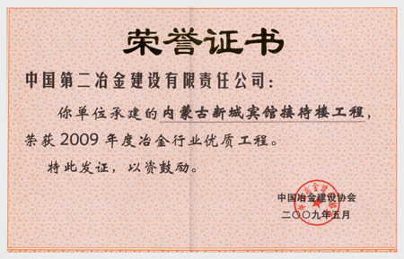 內(nèi)蒙古新城賓館接待樓獲冶金行業(yè)優(yōu)質(zhì)工程、中冶集團(tuán)優(yōu)質(zhì)工程、內(nèi)蒙古自治區(qū)優(yōu)質(zhì)樣板工程、內(nèi)蒙古自治區(qū)用戶(hù)滿(mǎn)意工程。