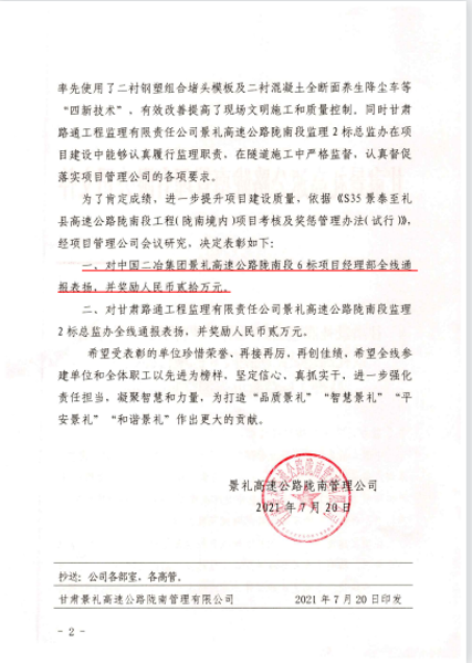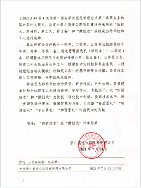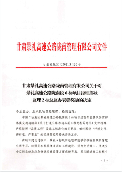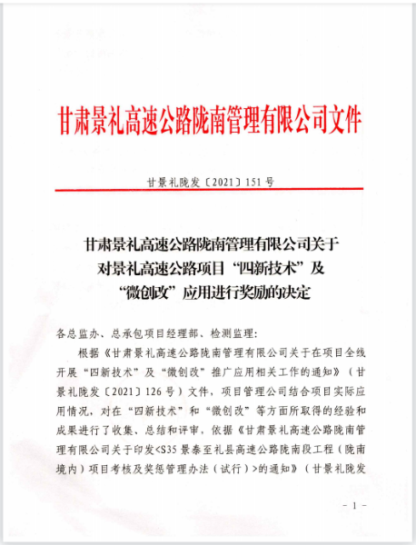 近日,甘肅分公司景禮項(xiàng)目部在甘肅景禮高速公路隴南管理有限公司組織的“四新技術(shù)”、“微創(chuàng)改”推廣應(yīng)用、“品質(zhì)工程”及施工標(biāo)準(zhǔn)化建設(shè)等檢查評(píng)比中名列前茅,項(xiàng)目管理公司對(duì)景禮項(xiàng)目部進(jìn)行通報(bào)表揚(yáng),并給予獎(jiǎng)勵(lì)40萬元。