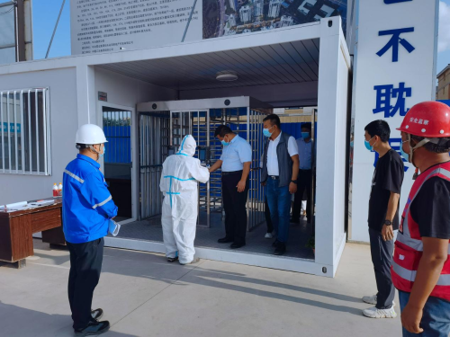 劉海泉一行首先深入施工現(xiàn)場(chǎng),對(duì)進(jìn)場(chǎng)務(wù)工人員來源地、供貨商貨源地等一些項(xiàng)目基本概況進(jìn)行了解,并對(duì)現(xiàn)場(chǎng)體溫測(cè)量登記臺(tái)賬、外來人員進(jìn)場(chǎng)登記臺(tái)賬、現(xiàn)場(chǎng)行程碼和健康碼設(shè)置情況、施工現(xiàn)場(chǎng)作業(yè)人員口罩佩戴情況,以及辦公區(qū)每日消殺記錄進(jìn)行詳細(xì)檢查。隨后,劉海泉一行來到項(xiàng)目隔離區(qū),仔細(xì)檢查了現(xiàn)場(chǎng)隔離室設(shè)置情況,并叮囑項(xiàng)目部管理人員,隔離間的配備要符合要求,確保安全可靠。