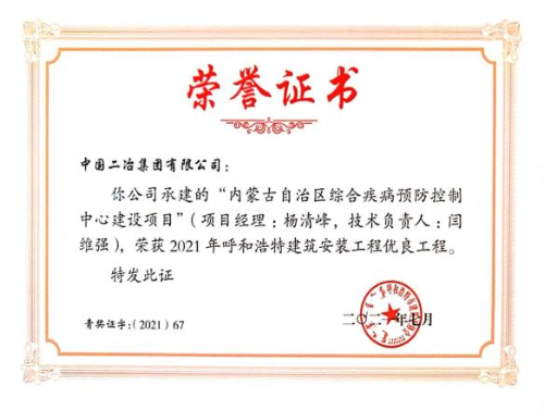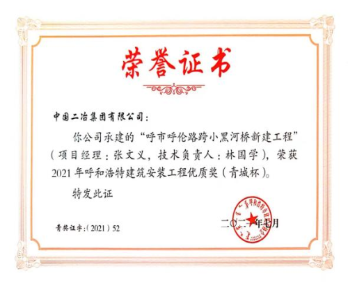 近日,呼和浩特市建筑業(yè)協(xié)會公布了2021年度呼和浩特建筑安裝工程優(yōu)質(zhì)獎的評審結(jié)果。由中國二冶集團內(nèi)蒙古分公司承建的呼和浩特市呼倫路跨小黑河橋工程榮獲建筑安裝工程優(yōu)質(zhì)獎(“青城杯”),內(nèi)蒙古自治區(qū)綜合疾病預(yù)防與控制中心項目榮獲“優(yōu)良工程獎”。