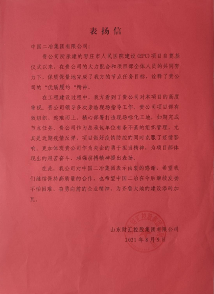 8月9日,中國(guó)二冶收到業(yè)主單位山東財(cái)匯控股集團(tuán)有限公司的表揚(yáng)信,來信對(duì)中國(guó)二冶集團(tuán)科學(xué)組織、精心部署表示感謝,對(duì)棗莊人民醫(yī)院建設(shè)(EPC)項(xiàng)目當(dāng)前的各項(xiàng)工作進(jìn)展情況給予了高度贊揚(yáng)。
