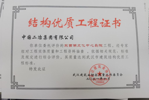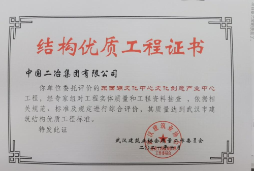 10月16日,由中國二冶承建的武漢東西湖文化中心項目文化創(chuàng)意產(chǎn)業(yè)中心及劇院主體結(jié)構(gòu)完成驗收,并獲武漢市優(yōu)質(zhì)結(jié)構(gòu)工程獎。