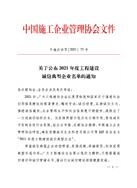 10月28日,由中國施工企業(yè)管理協(xié)會(huì)主辦的2021年度工程建設(shè)企業(yè)信用評(píng)價(jià)結(jié)果及誠信企業(yè)評(píng)選揭曉,中國二冶通過AAA信用等級(jí)年審并被授予“2021年度工程建設(shè)誠信典型企業(yè)”。