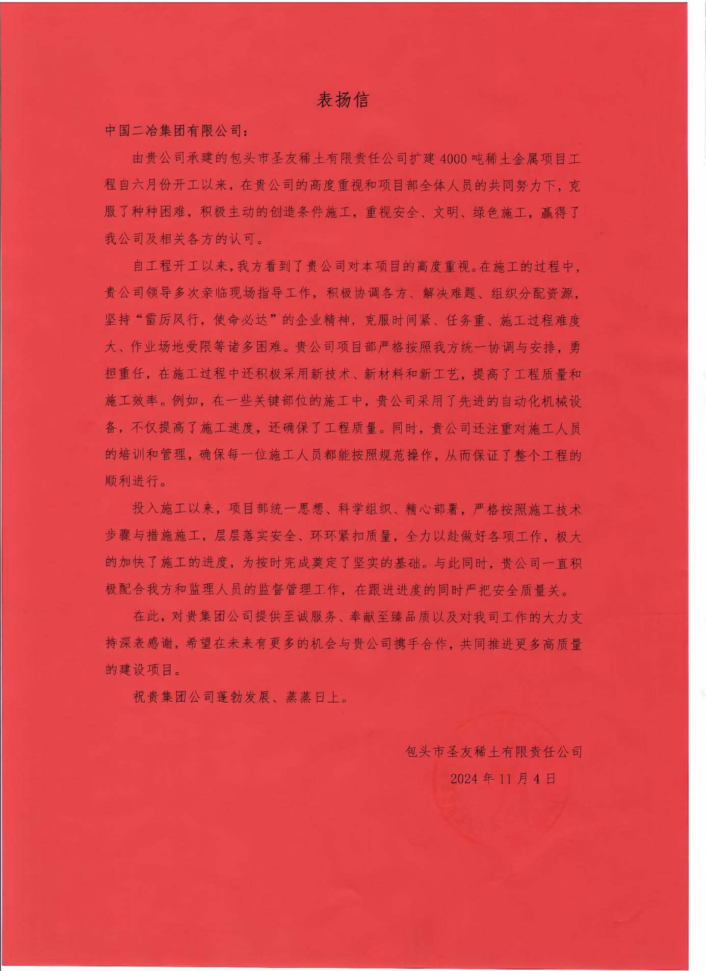 11月4日,中國二冶收到包頭市圣友稀土有限責(zé)任公司表揚信,對包頭市圣友稀土有限責(zé)任公司擴建4000噸稀土金屬項目的高質(zhì)高效履約表示贊揚和認可。