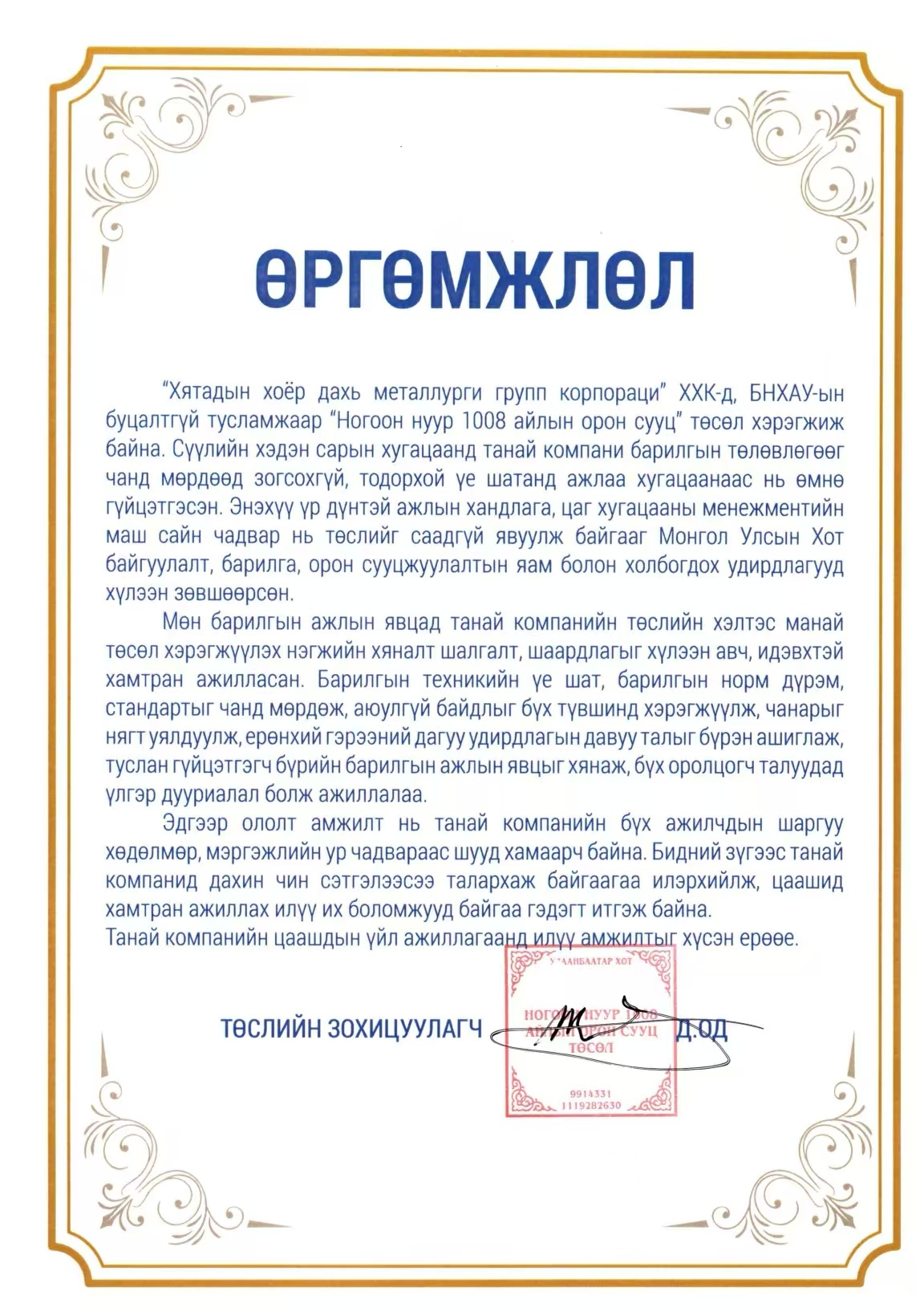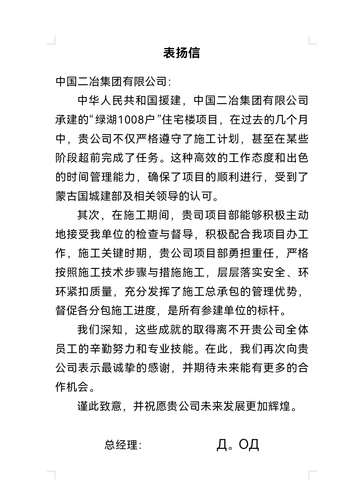 表揚(yáng)信指出,由中華人民共和國(guó)援建、中國(guó)二冶承建的“綠湖1008戶”住宅樓項(xiàng)目遵守施工計(jì)劃,在重要節(jié)點(diǎn)重要工序超前完成了施工任務(wù),受到了蒙古國(guó)城建部及相關(guān)領(lǐng)導(dǎo)的認(rèn)可。施工期間,項(xiàng)目部能夠主動(dòng)接受檢查與督導(dǎo),積極配合,協(xié)同發(fā)力,尤其是施工關(guān)鍵時(shí)期,項(xiàng)目部勇?lián)厝?,?yán)格按照工程技術(shù)、設(shè)計(jì)規(guī)范、施工步驟與措施,層層落實(shí)安全、環(huán)保責(zé)任,緊扣質(zhì)量標(biāo)準(zhǔn),抓實(shí)分部分項(xiàng)工程質(zhì)量,充分發(fā)揮了施工總承包方的管理優(yōu)勢(shì),全方位督促各分包施工進(jìn)度,加快項(xiàng)目建設(shè)步伐,是所有參建單位的標(biāo)桿,充分彰顯了中國(guó)央企的實(shí)力。