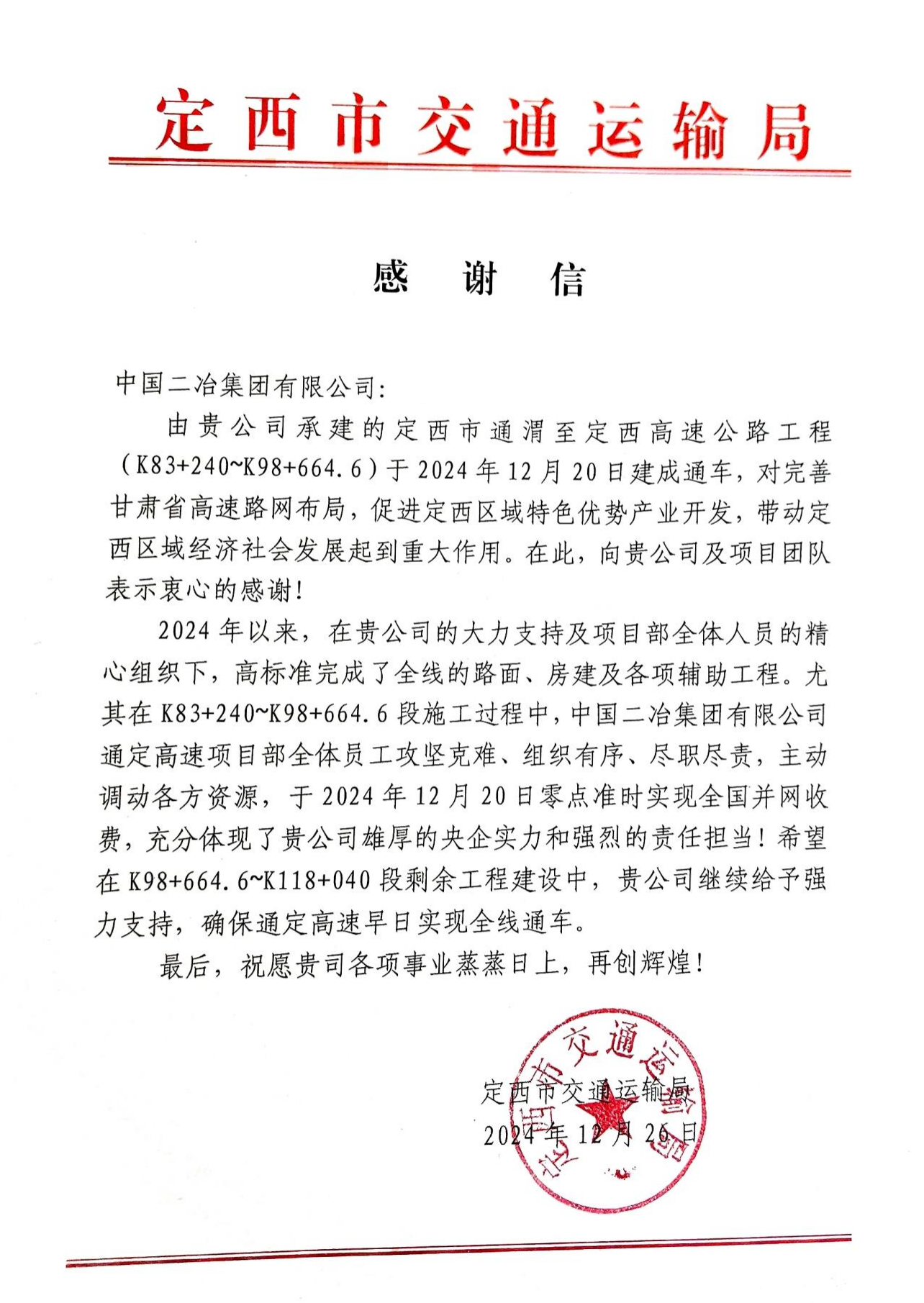 定西市交通運(yùn)輸局在信中提到,12月20日,通定高速K83+240-K98+664.6標(biāo)段順利建成通車,零點(diǎn)準(zhǔn)時(shí)實(shí)現(xiàn)全國(guó)并網(wǎng)收費(fèi),對(duì)于推動(dòng)定西市區(qū)域經(jīng)濟(jì)發(fā)展、優(yōu)化甘肅省交通網(wǎng)絡(luò)布局具有重要意義。今年以來(lái),中國(guó)二冶通定高速項(xiàng)目部攻堅(jiān)克難、組織有序、盡職盡責(zé),主動(dòng)協(xié)調(diào)資源,錨定通車目標(biāo),憑借精湛的技術(shù)實(shí)力、嚴(yán)格的質(zhì)量管理體系以及高效的團(tuán)隊(duì)協(xié)作能力高標(biāo)準(zhǔn)完成通車任務(wù),充分展現(xiàn)出央企的雄厚實(shí)力和強(qiáng)烈的責(zé)任擔(dān)當(dāng),愿中國(guó)二冶在項(xiàng)目剩余建設(shè)過(guò)程中給予大力支持,力爭(zhēng)早日實(shí)現(xiàn)全線通車目標(biāo)。