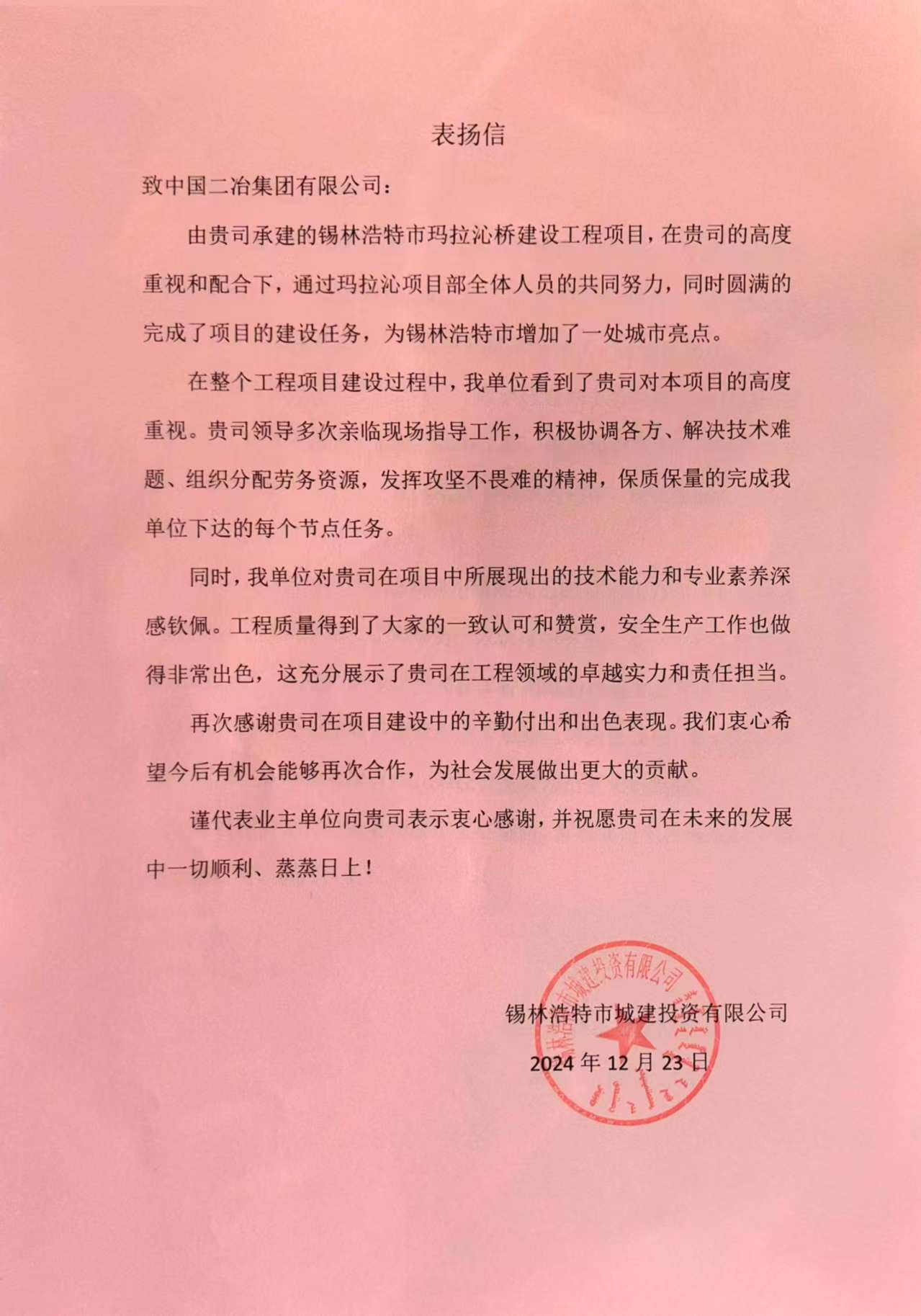 錫林浩特市建設(shè)投資有限公司在表?yè)P(yáng)信中對(duì)中國(guó)二冶瑪拉沁橋參建團(tuán)隊(duì)的辛勤付出和出色表現(xiàn)表示衷心感謝。表?yè)P(yáng)信稱,自項(xiàng)目建設(shè)以來(lái),項(xiàng)目部全體人員發(fā)揚(yáng)聚力攻堅(jiān)、善作善成的拼搏精神,積極協(xié)調(diào)資源、攻克技術(shù)難關(guān),領(lǐng)導(dǎo)靠前指揮,安全施工生產(chǎn),保質(zhì)保量完成每個(gè)節(jié)點(diǎn)目標(biāo),工程質(zhì)量得到廣泛認(rèn)可和贊賞,以卓越實(shí)力和央企擔(dān)當(dāng)為錫林浩特市增添了一處城市亮點(diǎn),祝愿中國(guó)二冶蓬勃發(fā)展、蒸蒸日上。