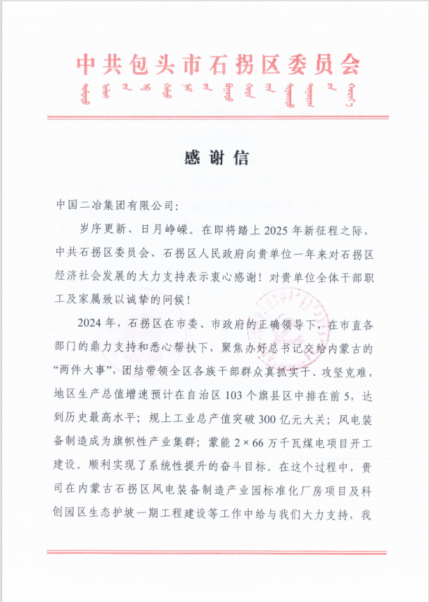 信中指出,2024年,石拐區(qū)在市委、市政府的正確領(lǐng)導(dǎo)下,在市直各部門的鼎力支持和悉心幫扶下,聚焦辦好習(xí)近平總書記交給內(nèi)蒙古的“兩件大事”,團(tuán)結(jié)帶領(lǐng)全區(qū)各族干部群眾真抓實(shí)干、攻堅(jiān)克難,地區(qū)生產(chǎn)總值增速預(yù)計在自治區(qū)103個旗縣區(qū)中排在前5,達(dá)到歷史最高水平;規(guī)上工業(yè)總產(chǎn)值突破300億元大關(guān);風(fēng)電裝備制造成為旗幟性產(chǎn)業(yè)集群;蒙能2×66萬千瓦煤電項(xiàng)目開工建設(shè)。順利實(shí)現(xiàn)了系統(tǒng)性提升的奮斗目標(biāo)。在這個過程中,中國二冶在內(nèi)蒙古石拐區(qū)風(fēng)電裝備制造產(chǎn)業(yè)園標(biāo)準(zhǔn)化廠房項(xiàng)目及科創(chuàng)園區(qū)生態(tài)護(hù)坡一期項(xiàng)目等工程建設(shè)中給予大力支持,我們銘記在心、深懷感激。明年是“十四五”規(guī)劃的收官之年,也是石拐區(qū)爬坡過坎、站上新的歷史臺階的關(guān)鍵一年。我們將繼續(xù)堅(jiān)持以習(xí)近平新時代中國特色社會主義思想為指導(dǎo),認(rèn)真貫徹落實(shí)上級各項(xiàng)部署要求,以永不懈怠的精神狀態(tài)和一往無前的奮斗姿態(tài),凝心聚力、團(tuán)結(jié)拼搏,奮力實(shí)現(xiàn)歷史性跨越的奮斗目標(biāo)。
