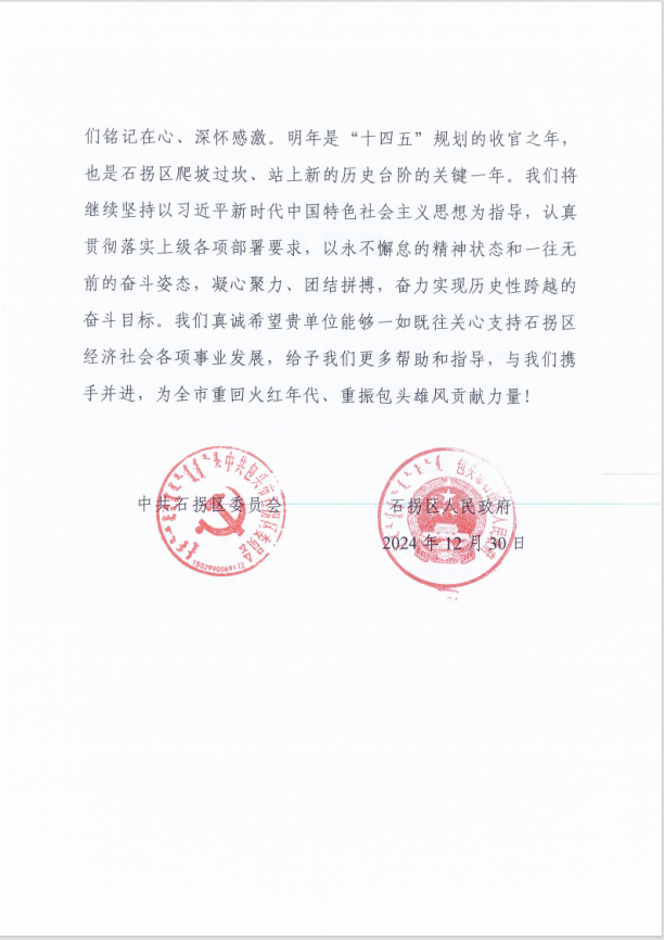 信中最后,石拐區(qū)政府真誠希望中國二冶能夠一如既往關(guān)心支持石拐區(qū)經(jīng)濟(jì)社會各項(xiàng)事業(yè)發(fā)展,給予石拐區(qū)更多幫助和指導(dǎo),并攜手并進(jìn),為全市重回火紅年代、重振包頭雄風(fēng)貢獻(xiàn)力量!