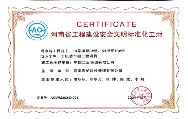近日,由中國二冶承建的尚中苑(西苑)工程項(xiàng)目榮獲河南省工程建設(shè)協(xié)會(huì)“河南省工程建設(shè)安全文明標(biāo)準(zhǔn)化工地”榮譽(yù)稱號。