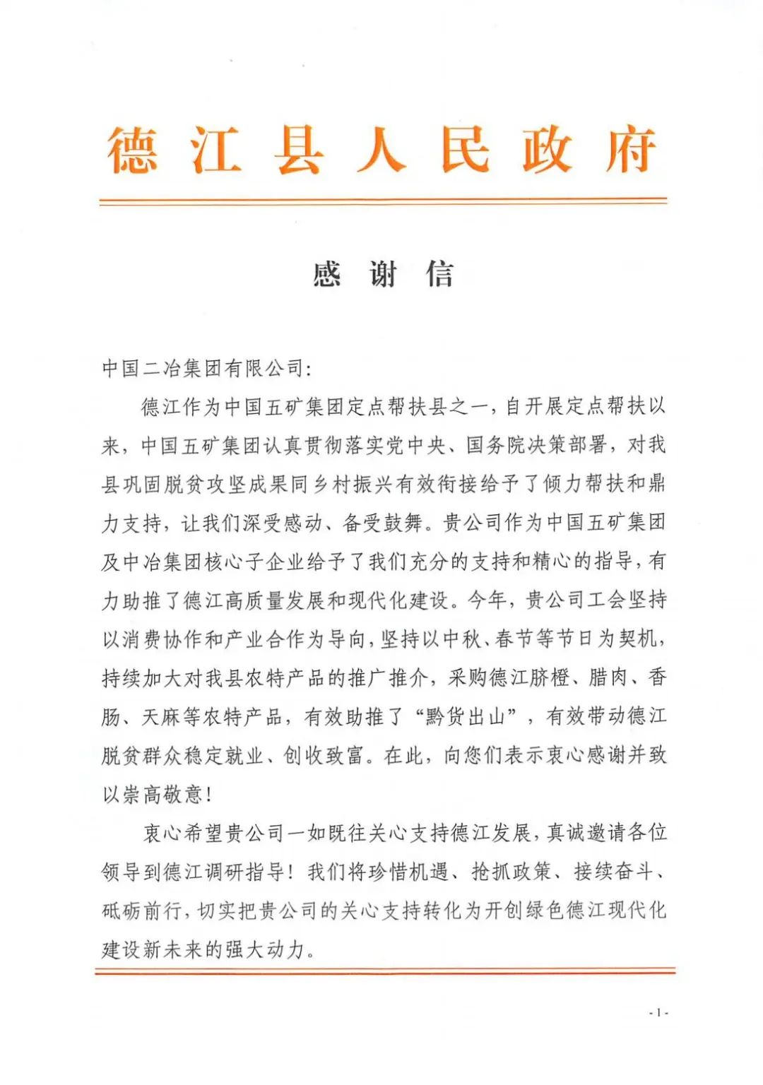 1月20日,中國二冶收到貴州省銅仁市德江縣人民政府感謝信,對中國二冶在助推“黔貨出山”,帶動(dòng)德江脫貧群眾穩(wěn)定就業(yè)、創(chuàng)收致富方面作出的貢獻(xiàn)表示感謝。