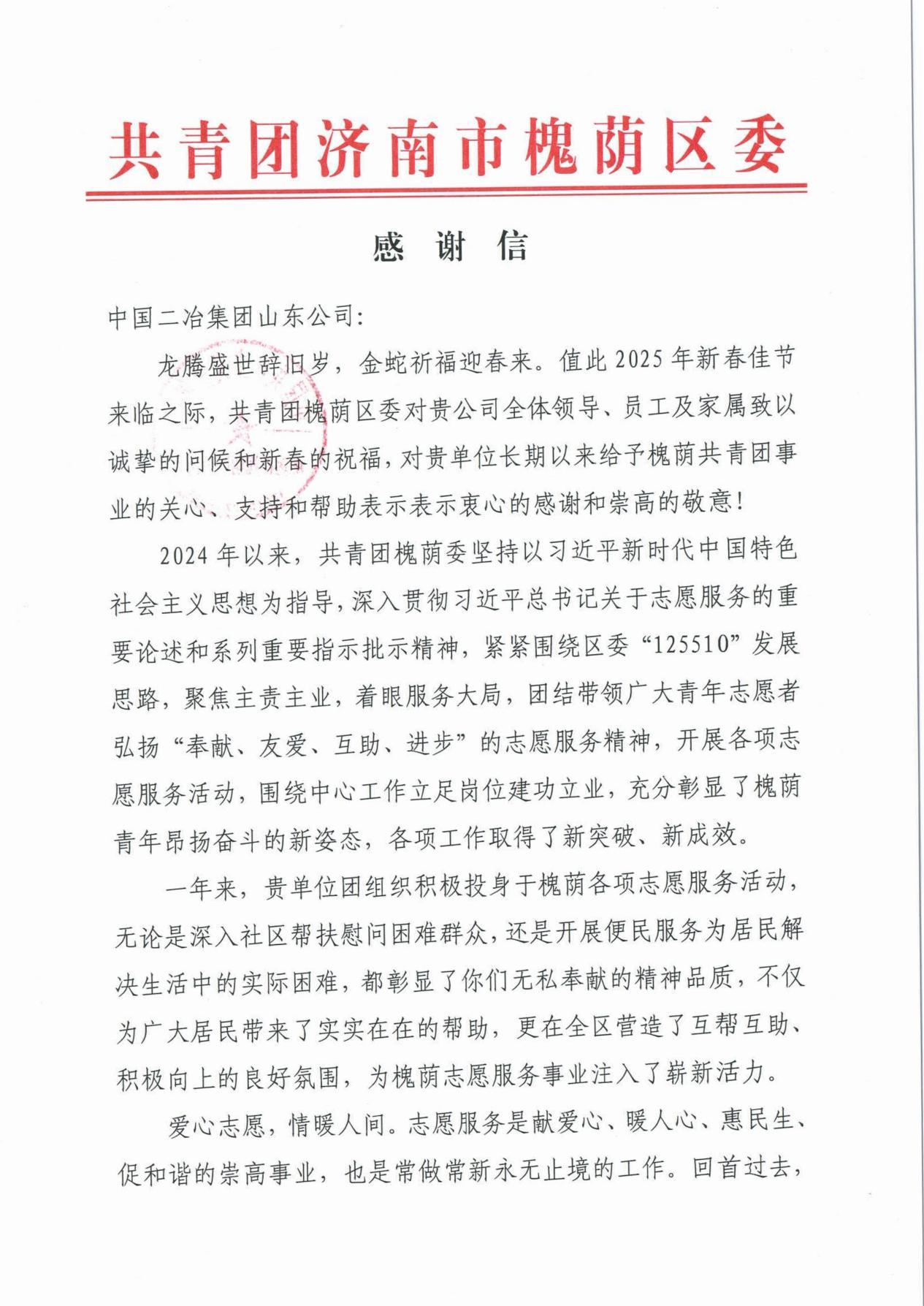 共青團濟南市槐蔭區(qū)委在信中寫道,山東公司團委積極投身于槐蔭各項志愿服務活動,無論是深入社區(qū)幫扶慰問困難群眾,還是開展便民服務為居民解決生活中的實際困難,彰顯了無私奉獻的精神品質(zhì),為廣大居民帶來了實實在在的幫助,更在槐蔭區(qū)營造了互幫互助、積極向上的良好氛圍,為槐蔭志愿服務事業(yè)注入了嶄新活力。