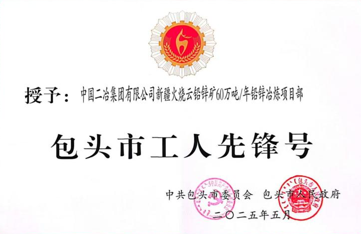 近日,中共包頭市委員會(huì)包頭市人民政府公布關(guān)于表彰包頭市五一勞動(dòng)獎(jiǎng)的決定,中國二冶新疆火燒云鉛鋅礦60萬噸/年鉛鋅冶煉工程項(xiàng)目榮獲“2025年包頭市工人先鋒號(hào)”榮譽(yù)稱號(hào)。
