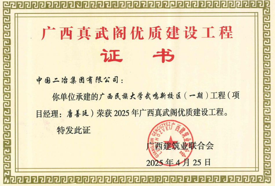 近日,廣西建筑業(yè)聯(lián)合會公布了2025年廣西建設工程“真武閣杯”獎(最高質(zhì)量獎)工程名單,中國二冶廣西民族大學武鳴新校區(qū)(一期)工程榮獲此獎項。