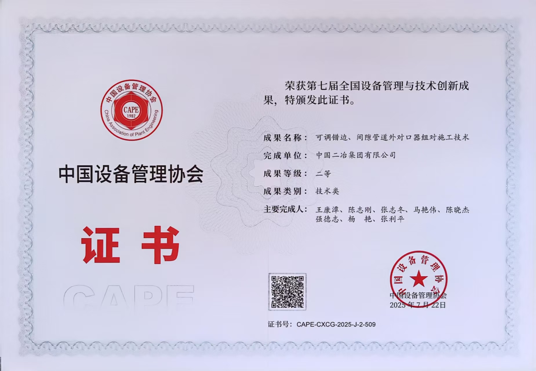 7月22日至23日,第七屆全國設備管理與技術創(chuàng)新成果交流大會在南京舉行。中國二冶申報的《可調錯邊、間隙管道外對口器組對施工技術》從2418項科研成果中脫穎而出,斬獲第七屆全國設備管理與技術創(chuàng)新成果二等獎。
