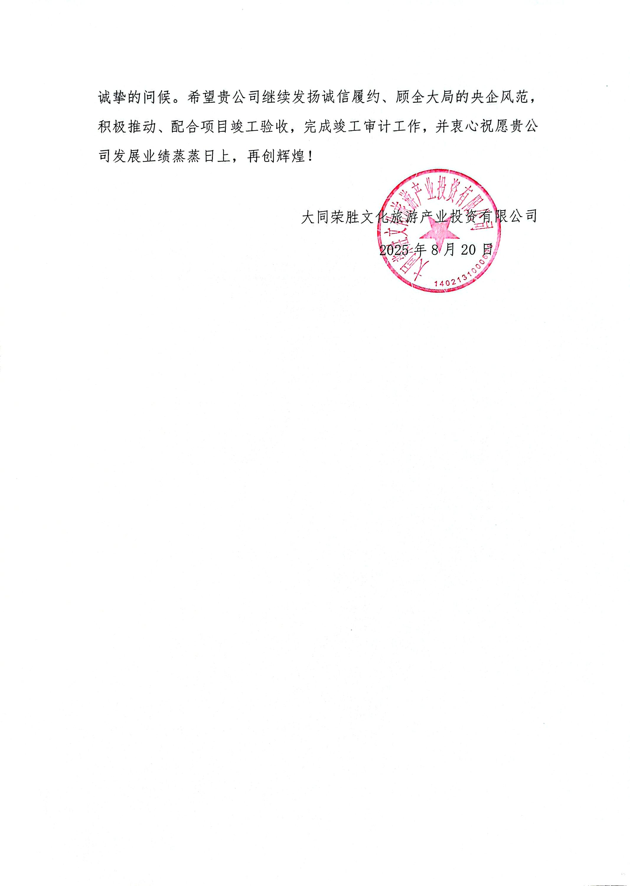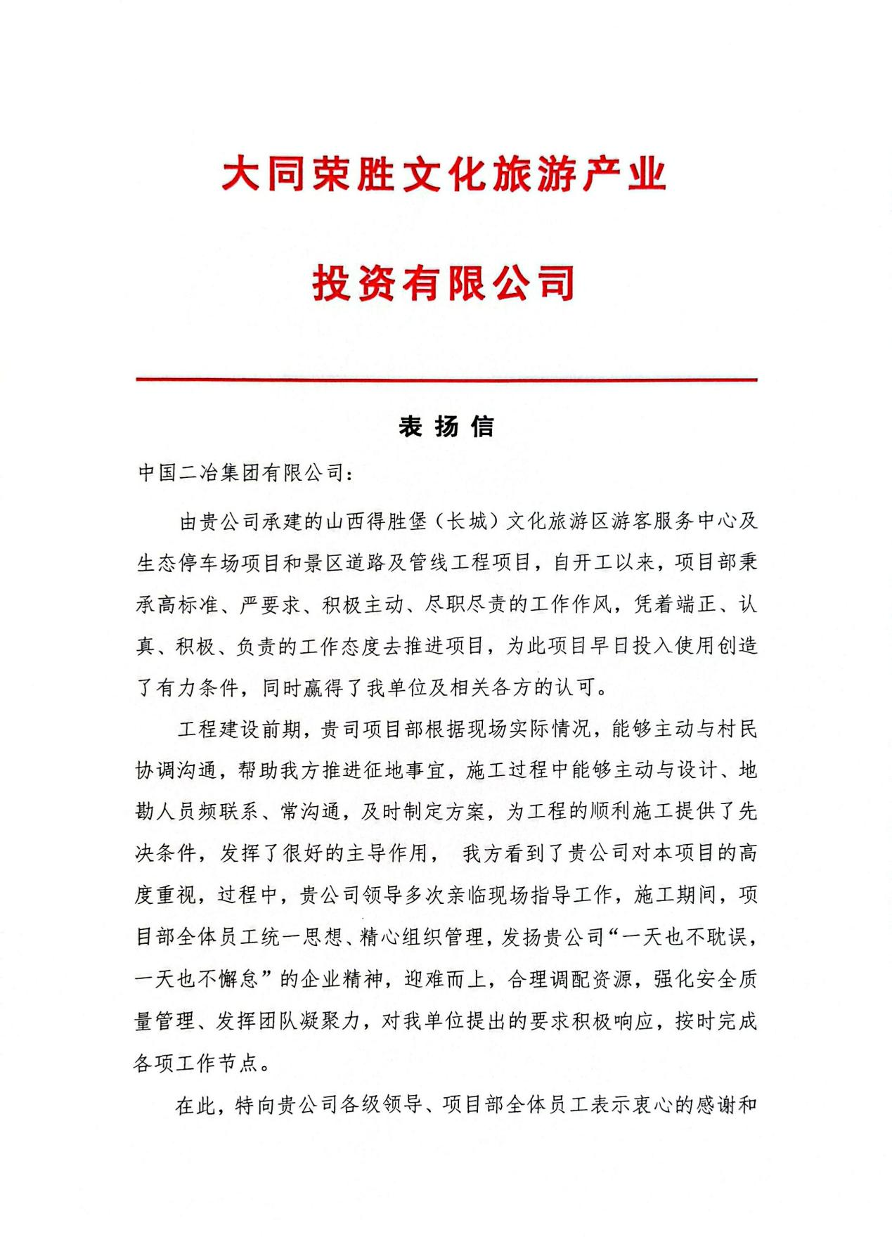 中國二冶收到大同榮勝文化旅游產(chǎn)業(yè)投資有限公司表揚信