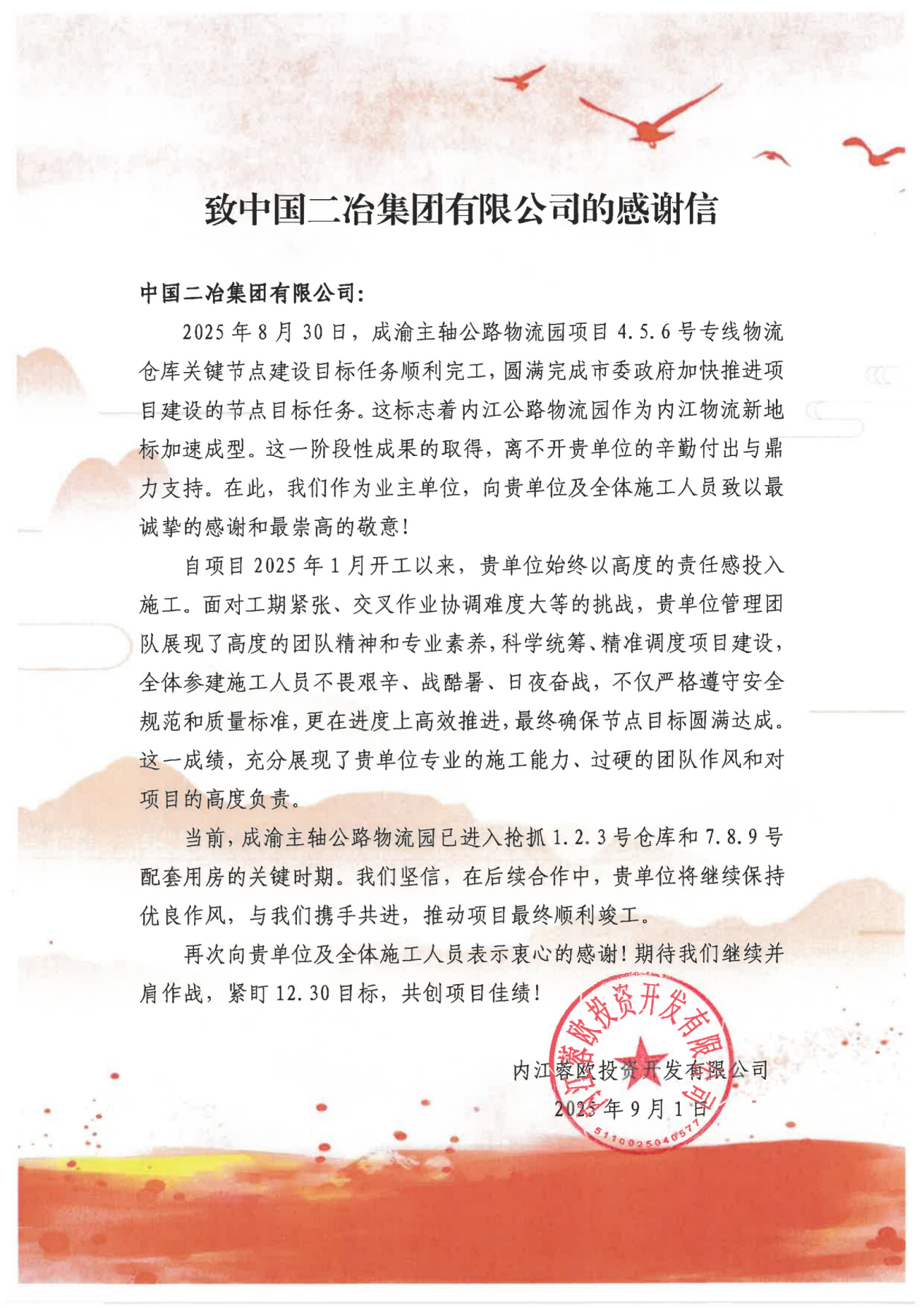 此封表揚(yáng)信不僅是對中國二冶項目團(tuán)隊的卓越表現(xiàn)的高度認(rèn)可,更是對中國二冶整體企業(yè)精神和綜合實(shí)力的有力肯定。這封信件不僅彰顯了中國二冶在復(fù)雜工程項目中的專業(yè)管理能力和高效執(zhí)行力,還體現(xiàn)了對合作伙伴關(guān)系的深度重視,進(jìn)一步提升了企業(yè)在行業(yè)內(nèi)的聲譽(yù)和影響力,為后續(xù)項目合作注入了強(qiáng)大動力。