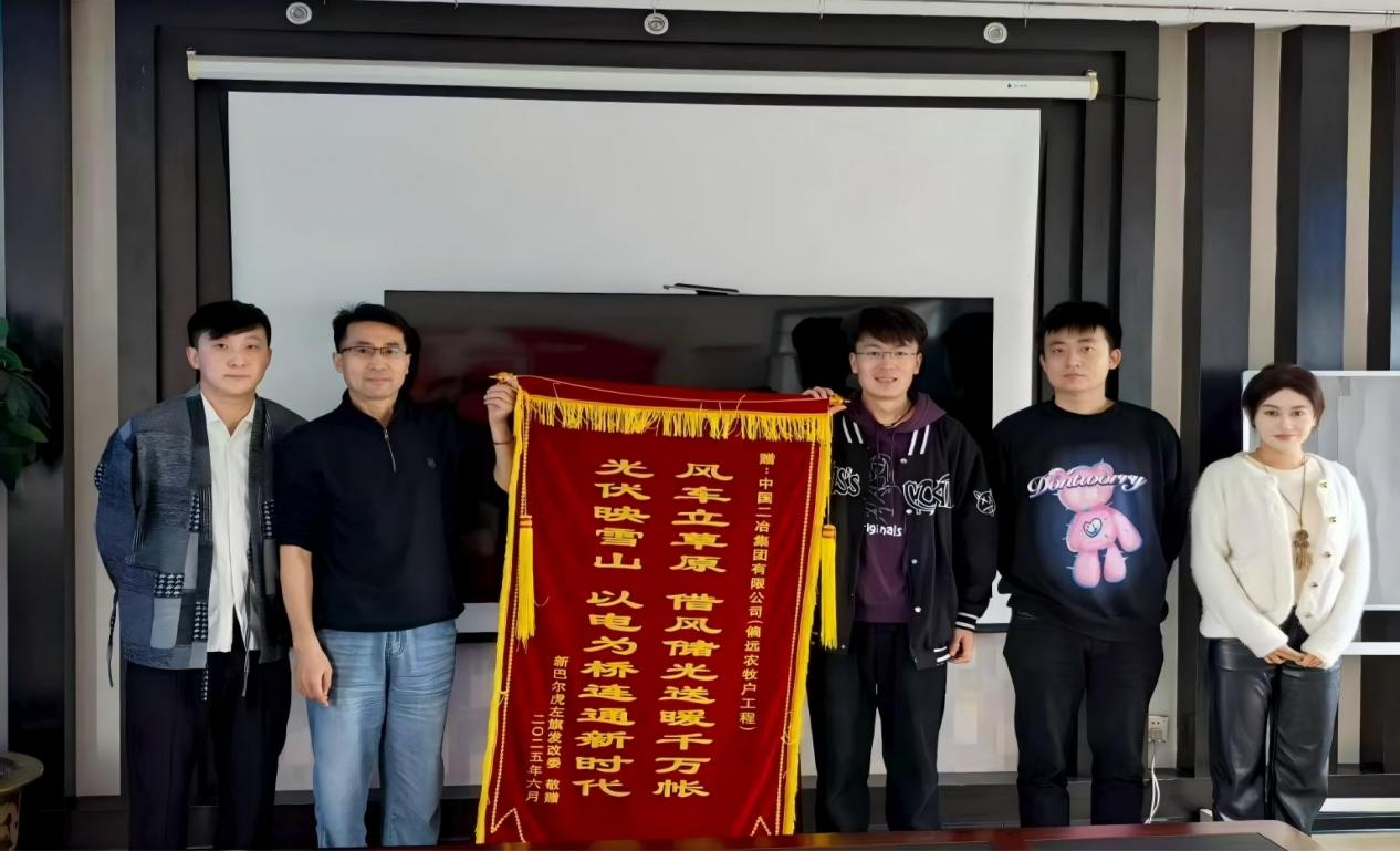 錦旗上題寫(xiě)“風(fēng)車立草原,借風(fēng)儲(chǔ)光送暖千萬(wàn)帳;光伏映雪山,以電為橋連通新時(shí)代”,生動(dòng)詮釋了項(xiàng)目的核心價(jià)值與深遠(yuǎn)意義。新巴爾虎左旗政府表示,該項(xiàng)目地處內(nèi)蒙古偏遠(yuǎn)牧區(qū),氣候條件惡劣、交通出行不便,整體施工環(huán)境極為艱苦。面對(duì)挑戰(zhàn),項(xiàng)目管理團(tuán)隊(duì)充分發(fā)揮技術(shù)與管理優(yōu)勢(shì),始終以“高標(biāo)準(zhǔn)、高質(zhì)量、高效率”為施工準(zhǔn)則,全力克服物資運(yùn)輸困難、極端天氣影響等多重難題,最終如期完成節(jié)點(diǎn)任務(wù)。該項(xiàng)目的順利推進(jìn),不僅成功解決了當(dāng)?shù)剞r(nóng)牧民的急難愁盼問(wèn)題,直接惠及數(shù)百戶農(nóng)牧民家庭,顯著提升了牧區(qū)群眾的生活品質(zhì);更通過(guò)產(chǎn)業(yè)配套升級(jí),為當(dāng)?shù)亟?jīng)濟(jì)可持續(xù)發(fā)展注入了新動(dòng)能,為邊疆牧區(qū)發(fā)展奠定了堅(jiān)實(shí)基礎(chǔ)。