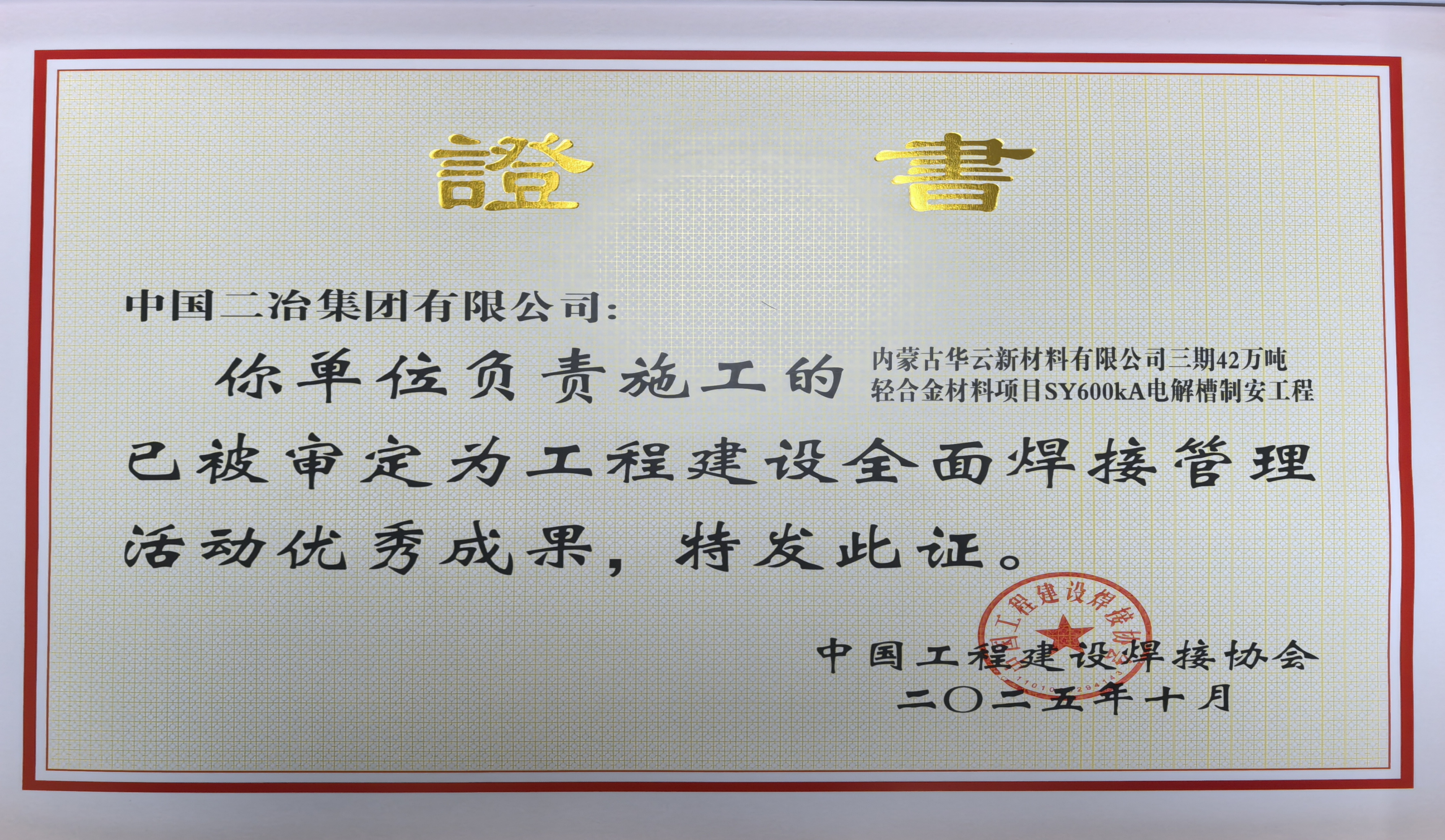 11月17日至19日,由中國工程建設(shè)焊接協(xié)會主辦的2025年度工程建設(shè)全面焊接管理活動成果發(fā)布暨經(jīng)驗交流會議在北京召開,由中國二冶承建的內(nèi)蒙古華云新材料有限公司三期42萬噸輕合金材料項目SY600kA電解槽制安工程、湄潭至甕安天然氣輸氣管道項目建設(shè)施工(二標(biāo)段)獲2025年度全國工程建設(shè)全面焊接管理活動優(yōu)秀成果獎。