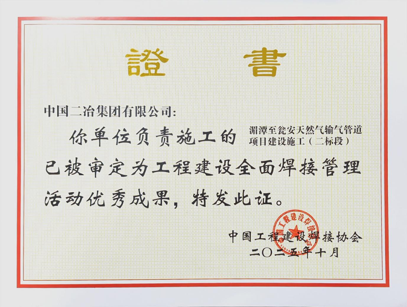 中國二冶兩項目榮獲工程建設(shè)全面焊接管理活動優(yōu)秀成果獎