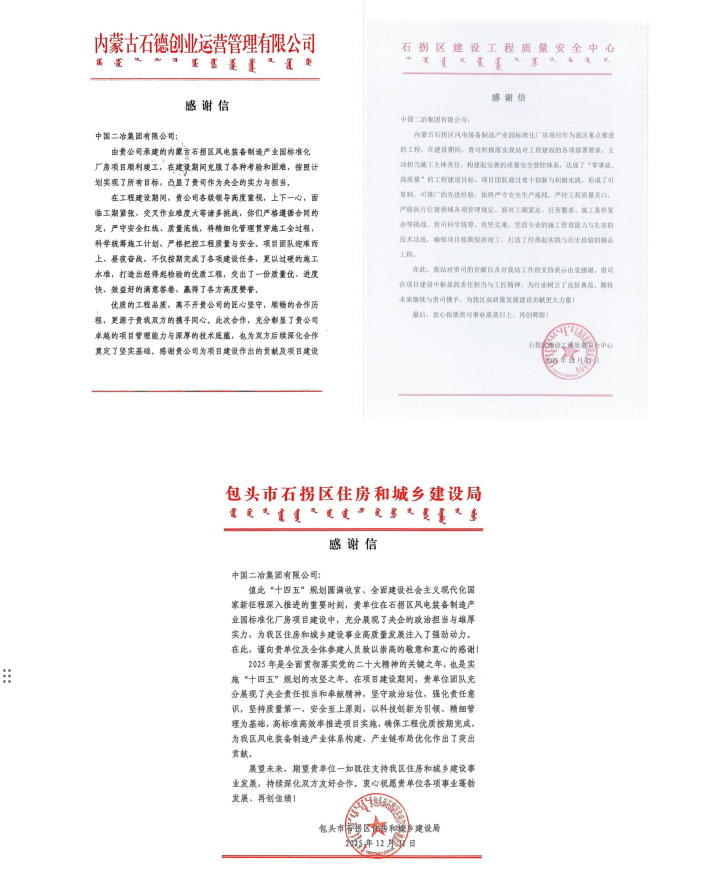 感謝信中表示,中國二冶在內(nèi)蒙古石拐區(qū)風(fēng)電裝備制造產(chǎn)業(yè)園標(biāo)準(zhǔn)化廠房項(xiàng)目建設(shè)過程中,充分展現(xiàn)了央企的政治擔(dān)當(dāng)與雄厚實(shí)力,為石拐區(qū)住房和城鄉(xiāng)建設(shè)事業(yè)高質(zhì)量發(fā)展注入了強(qiáng)勁動(dòng)力。在項(xiàng)目建設(shè)中,項(xiàng)目管理團(tuán)隊(duì)堅(jiān)守政治站位,堅(jiān)持質(zhì)量第一安全至上的原則,構(gòu)筑了完善的質(zhì)量安全管控體系,形成了可復(fù)制、可推廣的先進(jìn)經(jīng)驗(yàn)。憑借專業(yè)的施工管理能力與扎實(shí)的技術(shù)功底,解決了工期緊迫、任務(wù)繁重、施工條件復(fù)雜等挑戰(zhàn),確保了項(xiàng)目按期保質(zhì)竣工,交出了一份質(zhì)量優(yōu)、進(jìn)度快、效益好的滿意答卷,贏得了各方高度贊譽(yù)。