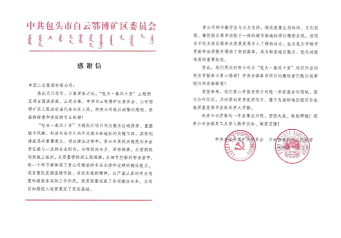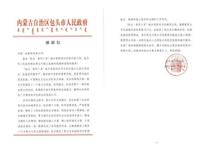 此次感謝及表揚,既是對中國二冶建設成果的高度認可,也是對團隊付出的充分信賴。未來,中國二冶將以此為激勵,持續(xù)深耕包頭城市建設領域,以更多優(yōu)質(zhì)精品工程賦能地方發(fā)展,為推動地區(qū)經(jīng)濟社會高質(zhì)量發(fā)展貢獻更大央企力量。