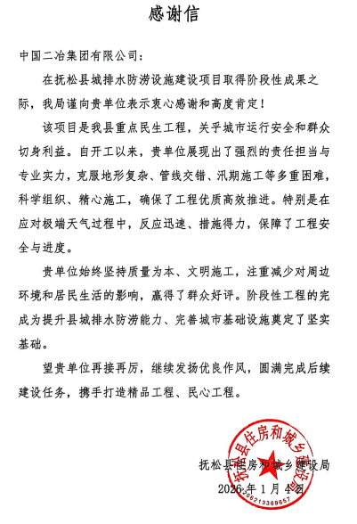 撫松縣城排水防澇設(shè)施建設(shè)項目是撫松縣重點民生工程,關(guān)乎城市運行安全和群眾切身利益。面對項目地形復(fù)雜、管線交錯、施工協(xié)調(diào)難度大等多重挑戰(zhàn),中國二冶充分彰顯央企責(zé)任與擔(dān)當(dāng),第一時間組建精干建設(shè)團(tuán)隊,制定科學(xué)詳盡的施工方案。施工過程中,團(tuán)隊始終秉持"精益求精"的質(zhì)量理念,精準(zhǔn)統(tǒng)籌施工各環(huán)節(jié),嚴(yán)格把控每一項技術(shù)標(biāo)準(zhǔn),建設(shè)者們奮戰(zhàn)在施工一線,以攻堅克難的奮斗姿態(tài)高效推進(jìn)項目建設(shè),完成了階段性建設(shè)任務(wù),大大提升了縣城的排水防澇能力。感謝信中,地方住建局充分肯定了中國二冶的央企綜合實力,高度認(rèn)可項目團(tuán)隊卓越的項目管理能力、過硬的施工技術(shù)水平以及務(wù)實高效的工作作風(fēng)。信中特別指出,建設(shè)團(tuán)隊發(fā)揚的艱苦奮斗、攻堅克難、精益求精精神,以及嚴(yán)謹(jǐn)認(rèn)真的專業(yè)態(tài)度,為提升縣城排水防澇能力、完善城市基礎(chǔ)設(shè)施奠定了堅實基礎(chǔ)。